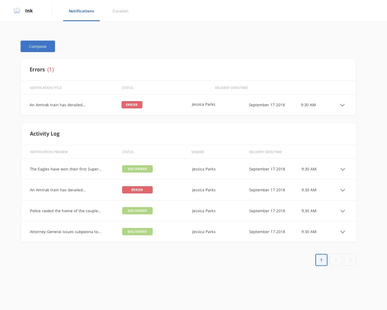 The first priority for Ink was the ability to send push notifications. I began my design process by researching and gathering the requirements with the product owner and identifying the key pieces that needed to be worked through. I broke down the requirements into a flow that included: drafting, labeling, targeting, scheduling. and publishing.