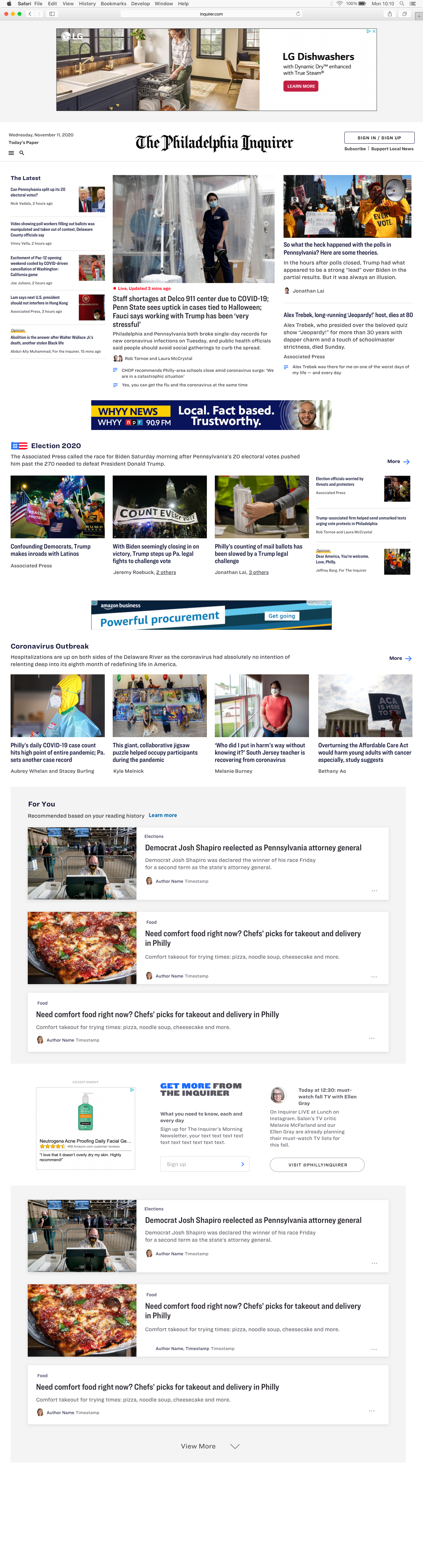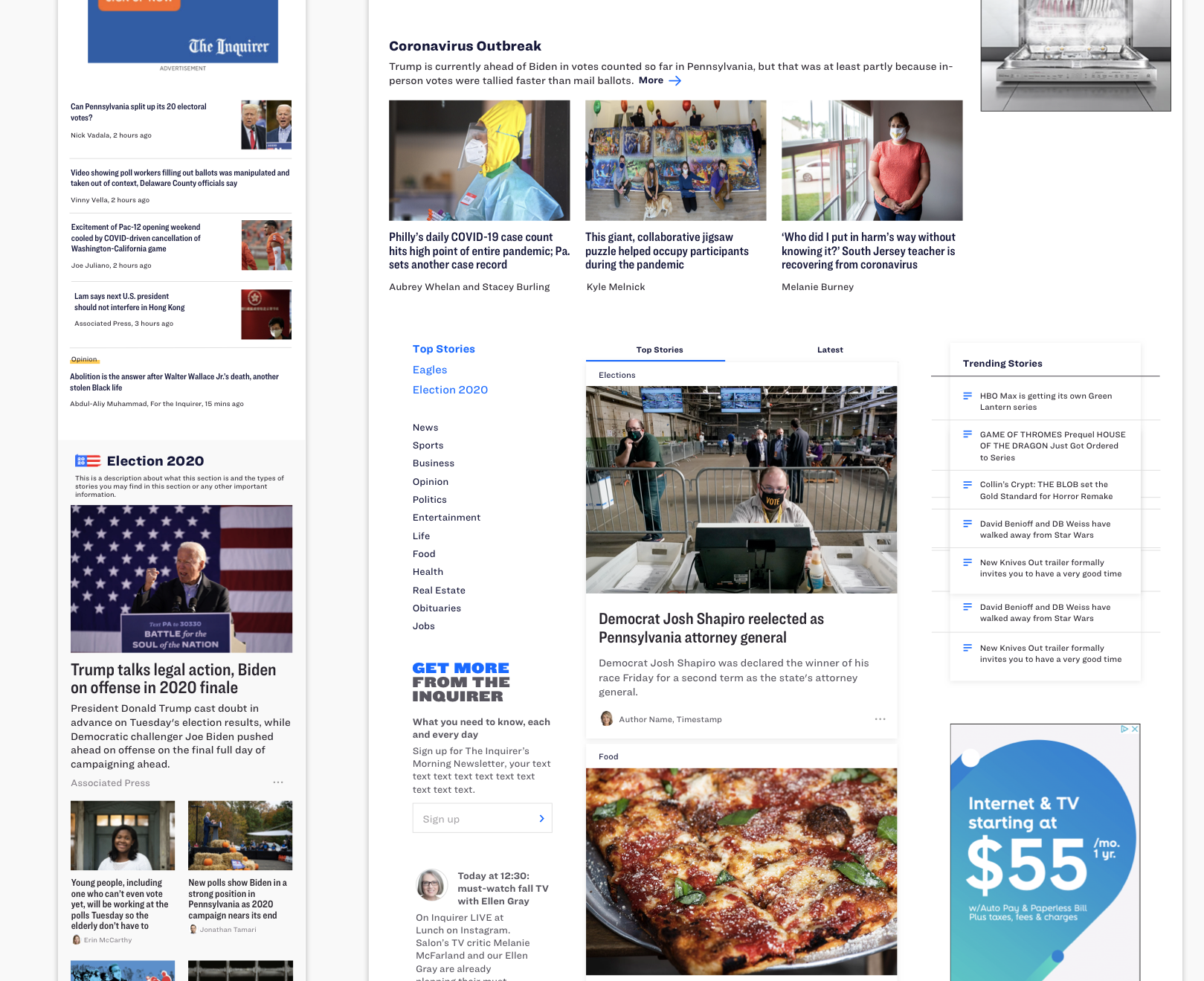 As part of the larger Inquirer 2.0 project, the homepage was in desperate need of a redesign. Our user research findings made it clear that our users rely heavily on our homepage to browse articles and find out the latest news for the day.